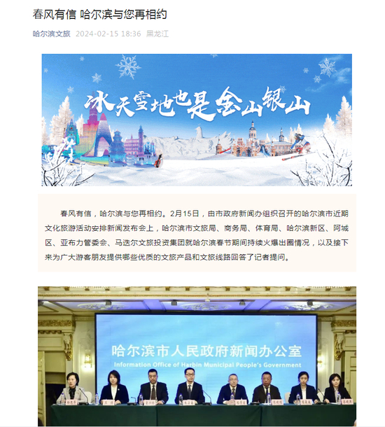 2月15日,哈尔滨文旅发布消息称,在由市政府新闻办组织召开的哈尔滨市近期文化旅游活动安排新闻发布会上,市文旅局副局长朱占春介绍,2月10日至14日,据大数据测算,全市累计接待游客629.8万人次,同比增长82.9%。冰雪大世界到访32.9万人次,同比增长115%;太阳岛雪博会到访3.3万人次,同比增长286.8%;亚布力滑雪旅游度假区到访8.4万人次,同比增长177.9%;侵华日军第七三一部队罪证陈列馆到访6.4万人次;哈药六厂版画博物馆到访7.2万人次,其他景区景点接待游客量均大幅增长。