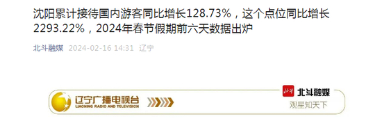 根据北斗融媒于2月16日发布的消息,2024年春节假期前六天,沈阳累计接待国内游客同比增长128.73%;实现国内旅游收入同比增长261.32%。