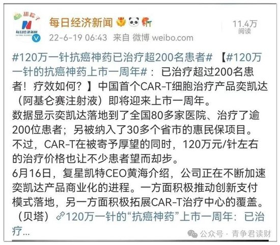 据媒体爆料120万一针的“抗癌神药”上市一周年, 已治疗超过200名患者!