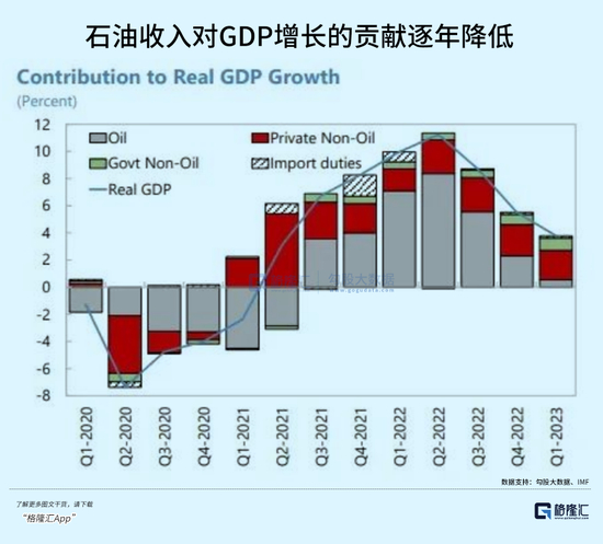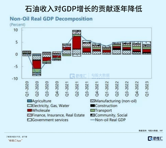 看下图,虽然石油依然是沙特最重要的收入来源,但它对GDP增长的贡献确实在稳定降低。
