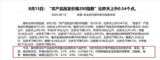 据农业农村部数据,8月8日,国内鲜活农产品批发市场重点监测的46个品种中,在价格涨幅前五名的品种里便有西瓜,较前一日涨3.4%。8月1日至8日当周,西瓜全国平均批发价为3.0元/公斤,环比上涨9%,同比上涨13%。