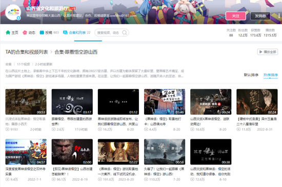 自2022年7月以来,山西文旅厅的B站号发布了多条有关《黑神话:悟空》的宣传视频,合集名称是“跟着悟空游山西”,其中8月20日至8月22日三天发布了四条和游戏相关的景点宣传视频。