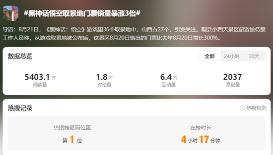 8月22日上午,话题#黑神话悟空取景地门票销量暴涨3倍#登上微博热搜第一。