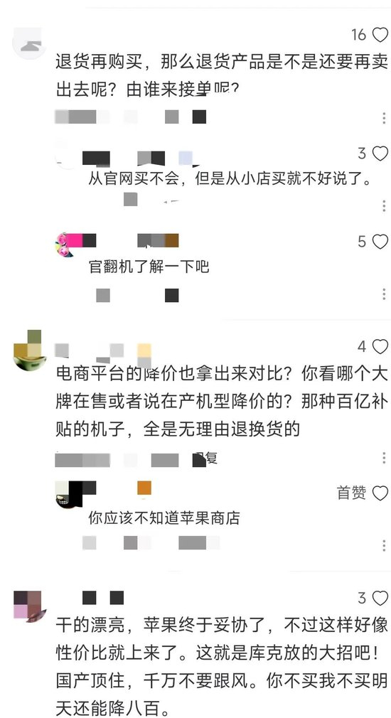 对于苹果手机又降价消息,有网友评论称“退货再购买”,也有人说“干得漂亮,苹果终于妥协了”。