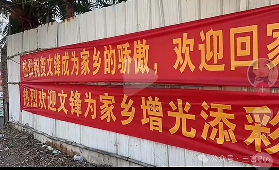 一条条横幅挂起,上面写着“热烈欢迎文锋,家乡的骄傲与希望”、“热烈欢迎文锋荣归故里,家乡因你而骄傲!”。