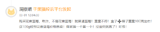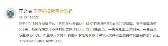 其中有多数用户表示,在抖音直播间网购蓝莓遭遇缺斤短两、发霉变质不处理等问题: