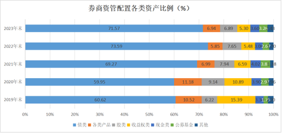 根据基金业协会发布的年报,截止2023年年末,券商资管71.57%配置债类资产。其次为资管产品,6.94%包括括私募资管产品、私募基金、银行理财、信托计划、保险资管等,较2022年同比增加1.09%。股类资产持续回撤,仅配置6.89%,同比缩减0.76%。收益权类资产5.3%,同比下降0.18%。现金类、公募基金、其他资产同比增持,2023年年末配置比例为3.6%、3.26%、2.43%,同比增加0.54%、0.59%、0.73%。根据中基协口径,现金类主要为银行存款,股类资产包括境内未上市股权、股票,收益权类包括各类资产收益权、买入返售资产、股票质押融资等。