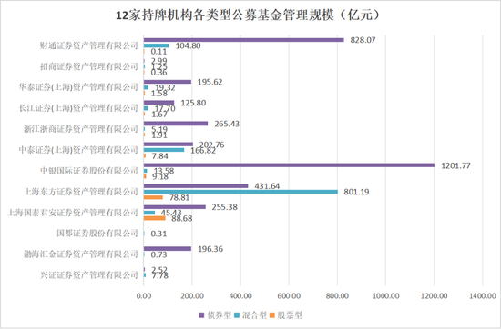 分产品类型来看,12家管理人管理的债券型基金规模最大,共计3708.35亿元。中银证券管理的债券型基金规模最大,1201.76亿元。其次为财通资管、东方资管,828.07亿元、431.64亿元。其次为混合型基金,合计管理规模1184.11亿元。其中,东证资管管理的混合型基金规模最大,801.19亿元。其次为中泰资管、财通资管,管理166.82、104.8亿元规模的混合型公募基金。股票型基金规模最少,12家管理人当中有三家未设股票型基金条线,9家管理人合计管理股票型基金规模190.14亿元,两极分化较大。国君资管管理的股票型基金规模最大,88.68亿元。其次为东证资管、中银证券,78.8、9.17亿元,第二名与第三名相差69.63亿元。