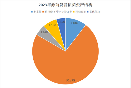 从债券类型来看,2023年,券商资管对于其他债权以及资产支持证券持续减持,2023年持有比例为3.13%、3.84%,同比减少1.45%、1.63%。此外,对于其他债权已连续减持超5年,连续两年持续坚持资产支持证券。考虑到2024年、2025年信用恶化程度超预期,后续年报中这一比例或将继续下降。券商资管主要配置于信用债,较去年比例有所下滑,结束了连续四年增配的趋势。券商资管投资的信用债中大部分为城投债,随着化债工作的推进高风险地区发债受到限制,城投债利率或将难以支撑券商资管较高的业绩比较基准预期这一部分比例将继续下降。2023年券商资管信用债配置比例为52.17%,同比下降0.35%。