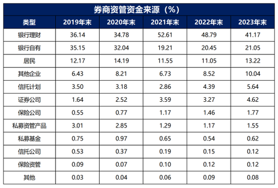 从券商资管资金来看理财仍为主要资金来源,理财资金占比为41.17%。不过,理财资金占比已连续三年持续下降,2021年理财资金占比为52.61%、2022年为48.79%。笔者推测这一定程度因为券商资管的通道业务出清,具体合作规模笔者将在下一篇理财投资合作机构全览文章中介绍。但另一方面来自银行自有、居民等的资金增加,除理财之外,仅有信托公司和其他资金来源占比有所回调。2023年年末银行自由、居民资金占比达到21.05%、13.22%,同比增加0.6%、2.17%。