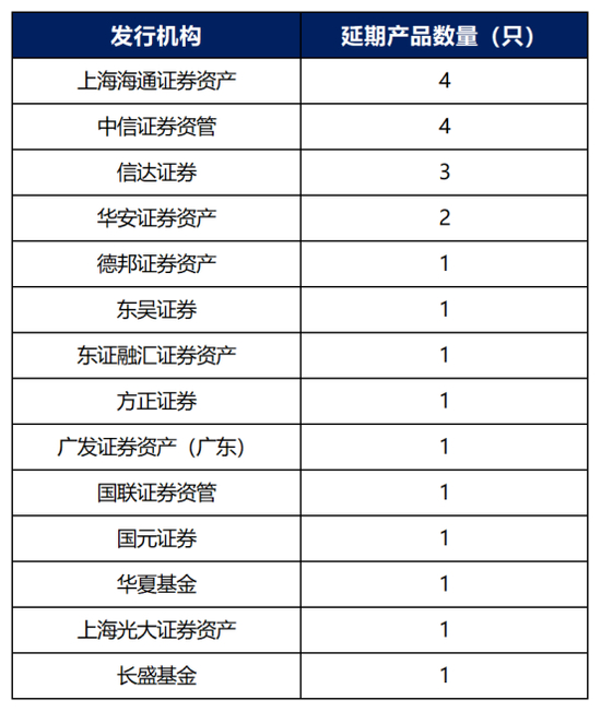随着券商资管成立放缓、公募基金资格一牌难求,加之合同延期目前大多数的券商资管计划仅得到了6个月延长时间,并未像往常一样延期到年底。最短的仅延长了2个月。最长的延长期限为九个月左右,延期至了2025年年底,不过数量较少,如海通资管的海通安裕中短债债券型集合资产管理计划等。截止2025年4月14日,2025年不到4个月时间共有14家管理人旗下23产品发布公告称产品延期。