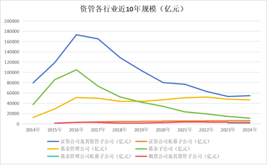 截止2024年年末,私募资管行业规模仍处于收缩,根据中基协统计,2024年私募资管行业规模为12.18万亿元,同比下降1%。券商资管为为数不多的规模正增长资管,根据基金业协会的数据,2024年券商资管规模为54656.87亿元,较去年同比增加1611.02亿元,增速达到3.04%。较年中来看,2024年券商资管规模老产品规模有所回落,致使券商资管保有规模较年中共计缩减3320.07亿元。