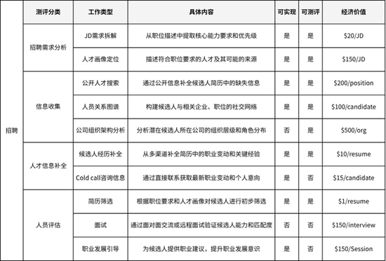 下面是一个结构化的工作任务拆解和经济价值的对齐,以及对任务在现阶段可实现性和可评测性的梳理: