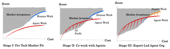 2. Agent与Human共同工作:技术可信与市场接受区域发生交集,交叉区域是AI带来的价值增量,包括(1)以低于最低人类成本提供可行服务,(2)帮助提升应对重复性、质量要求中等的工作内容。而高水准的工作内容,由于数据稀缺、难度更高、依然需要人来执行,此时由于稀缺性,企业获取的AI Profit可能会被用于支付高端工作产出。