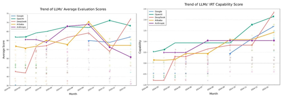 而利用IRT估计的能力得分,则可以很好地体现模型能力持续增长的趋势。我们可以观察到2024年10月之后Google Gemini模型能力的快速跟进,以及Deepseek v2与r1发布所带来的两次明显提升。