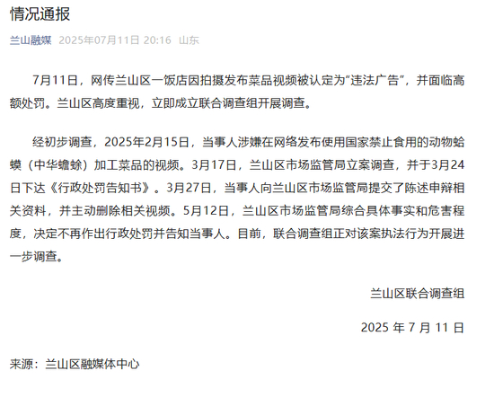 饭馆发布菜品视频被认定为“违法广告”,拟被罚45万元?山东临沂通报:介入调查
