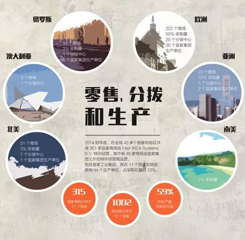 2014年财年(2013年9月1日至2014年8月31日),宜家商场的全球销售额为287亿欧元,增长5.9%,欧洲市场占了其总销量的69%。其中,北美、欧洲业绩保持了良好的态势,而中国成为增长最快的市场,增速达25%。这一财年,宜家在中国销售了88亿的商品,商场达到16家(2015年将新增两家),中国供应商为宜家提供了全球最高的25%采购量。不过,很多中国人并不了解宜家,关于宜家“设计抄袭”、“价格低质量就不好”、“供货商问题”等的误解依然存在。