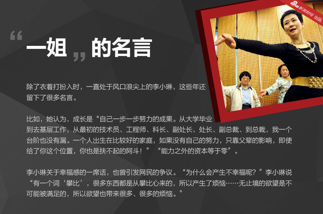 作为外人眼中的“女强人”,李小琳有个爱好是登山,她对媒体表示,做工作、干事业也像是登山,不过那是无形之山,征服它们需要更大的勇气和毅力,远比登自然之山艰难得多。