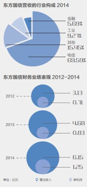 运营商一直是东方国信重要的收入来源,占比一度逾90%,近年来,跨行业扩张遍地开花,东方国信收入结构实现多元化,2015 年上半年,运营商的收入占比已下降至40% 多。
