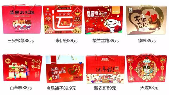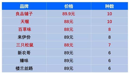 三只松鼠88元、来伊份89元、楼兰丝路89元、臻味89元、百草味88元、良品铺子89.9元、新农哥89元、天喔88元。