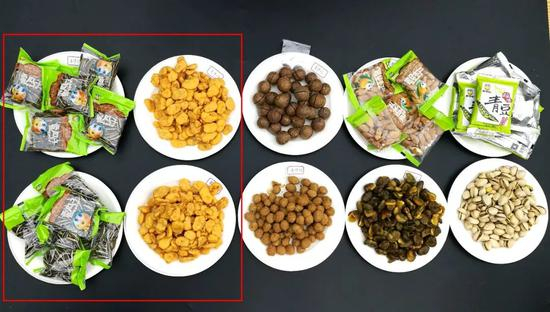 天喔10包、良品铺子10包、来伊份10包、百草味8包、新农哥8包、楼兰丝路8包、三只松鼠7包、臻味7包
