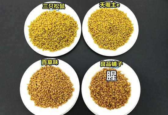 天喔、三只松鼠、百草味和良品铺子,都有蟹味葵花子,相比而言,良品铺子的葵花子腥味突出。
