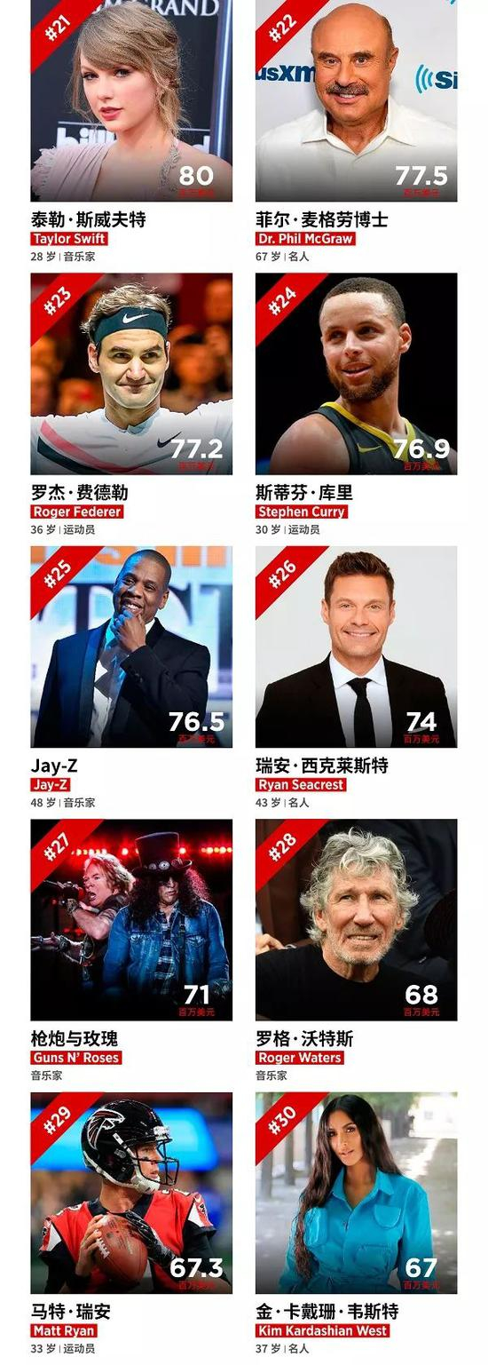 以下是前30位名人: