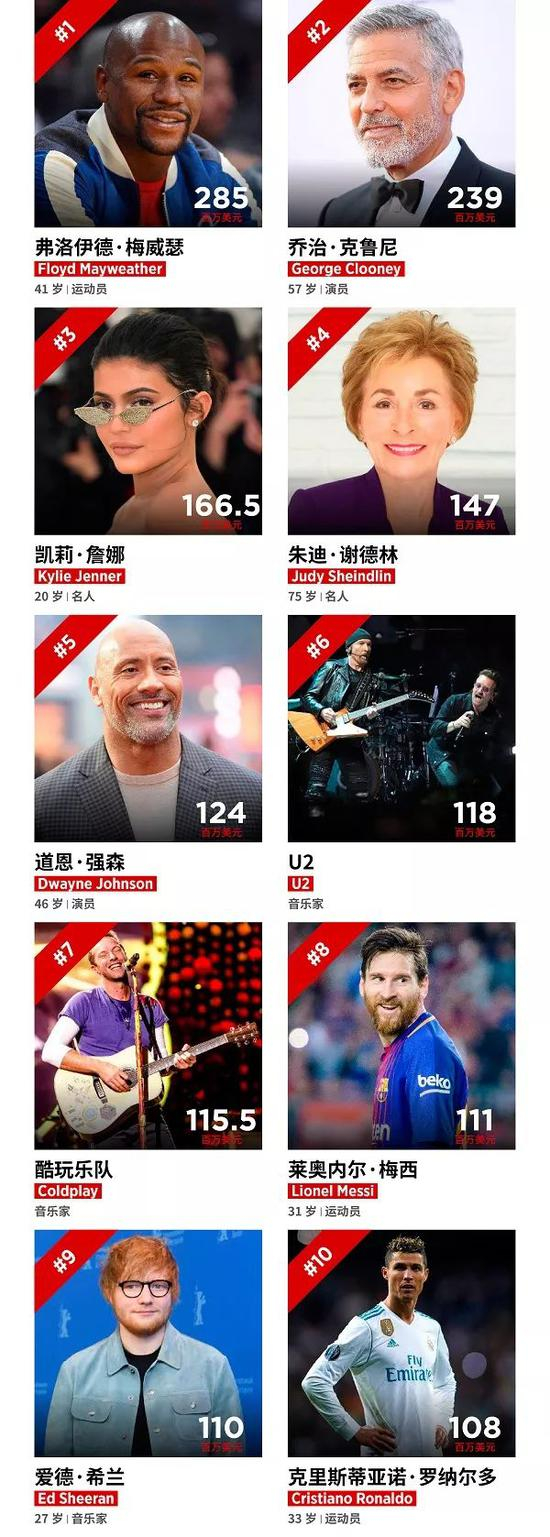 福布斯100名人榜计算世界名人的收入,今年是第20期。今年,弗洛伊德·梅威瑟(Floyd Mayweather)凭借2.85亿美元的税前收入雄踞榜首。他的收入几乎完全来自2017年8月和康纳·麦格雷戈(Conor McGregor,他也登上了名人榜)的对战。乔治·克鲁尼(George Clooney)排名第2位,收入为2.39亿美元,多数来自出售龙舌兰酒公司Casamigos。Casamigos公司由克鲁尼与同伴共同创办,已被酒业巨头Diageo收购。这笔收入为克鲁尼职业生涯中最高的一笔,也令他成为年收入最高的演员。