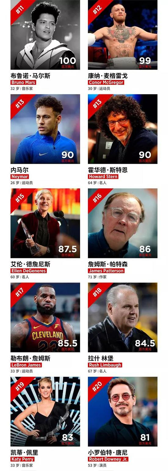 福布斯发布100名人榜单:收入最高的文娱名人都在这