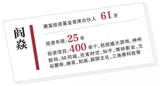 阎焱似乎总能捕捉到每个代际的优秀公司,其中包括一批对中国互联网发展具有创世意义的项目:盛大游戏、银联商务、神州数码、完美时空、58同城以及后来的知乎、映客、探探、如涵、博纳影业、三角兽等。