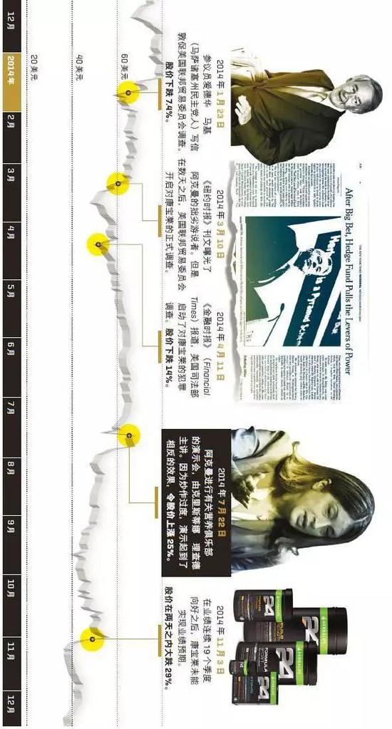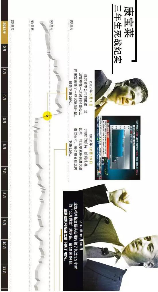 4月,有报道称,康宝莱同时受到了美国司法部(U.S. Department of Justice)和伊利诺伊州的总检察长的调查,公司股票继续暴跌。对于做多的投资,这些都是坏消息,到了11月,消息面进一步恶化,康宝莱宣布了它的第三季度业绩。在经过了连续19个好季度之后,公司没有实现盈利和销量预期。股票在接下来的两天之内下跌了将近30%,跌到了39.78美元。