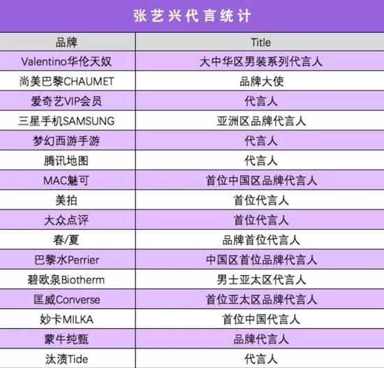 目前,张艺兴手握16个品牌合作。这当中既有年龄覆盖度极广的快消品,如蒙牛纯甄、汰渍,又有腾讯地图、爱奇艺VIP、美拍等刚需类手机APP,更涵盖CHAUMET、VALENTINO、CONVERSE、M.A.C等奢侈品和时尚潮牌。