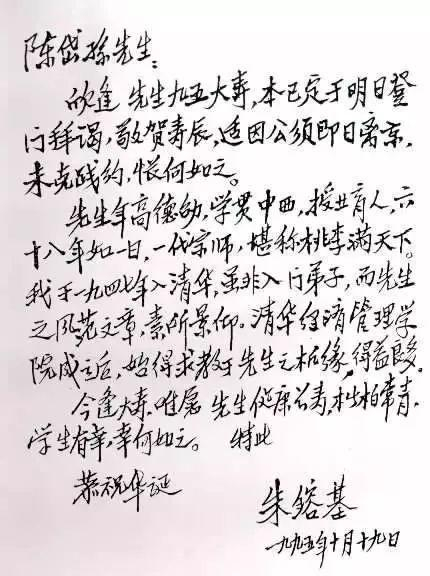 朱镕基致陈岱孙先生九十五岁寿辰贺信