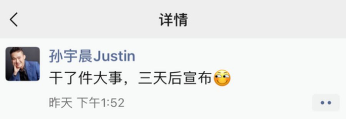 孙宇晨在6月1日和6月2日分别通过微信朋友圈发布了两则消息,一则是“干了件大事,三天后宣布”。