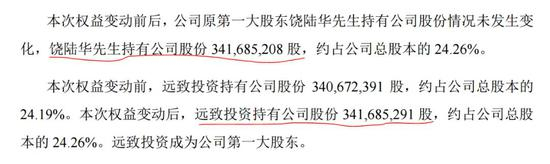 不过,截至6月19日,公司第一大股东已经发生变化。饶陆华持有公司股份24.26%,为公司第二大股东,原公司第二大股东远致投资通过增持已经成为公司第一大股东,持股数量比饶陆华多83股。
