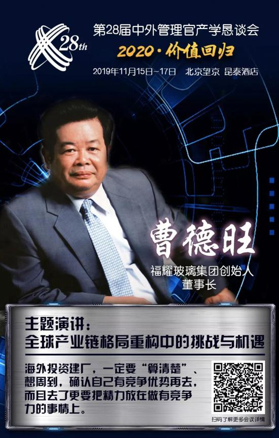 2019年11月15日至17日,由《中外管理》杂志社主办的第28届中外管理官产学恳谈会将在北京望京昆泰酒店举办,主题为“2020·价值回归”。在会上,曹德旺将告诉你:在中美交恶时,他的“美国工厂”在电影之外更内在的感受,以及他在汽车业衰退与全球供应链重组大势中,福耀玻璃的寒冬战略布局。