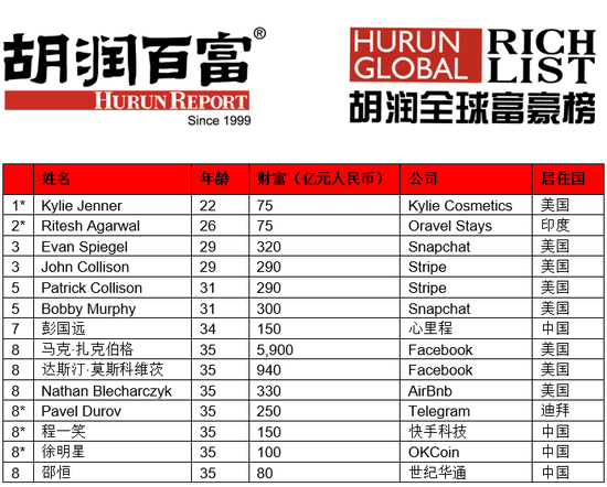 有14位35岁以下(含35岁)的白手起家十亿美金企业家。其中最年轻的是新人Kylie化妆品的KylieiJenner和“印度版Airbnb”OraveliiStays的Ritesh Agarwal。4位90后上榜。