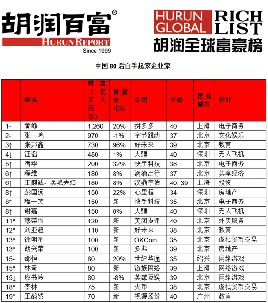 胡润全球少壮派白手起家富豪榜:黄峥张一鸣进前三