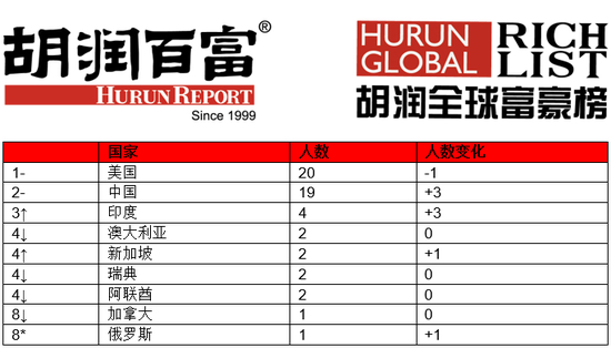 榜单上38人的财富比去年有所增长,其中18人是新面孔。8人的财富比去年减少,另外7人财富保持不变。去年榜单上的10人今年落榜,其中7人是因为年龄超过40岁,3人是因为财富没能达到上榜门槛。胡润表示:“中国增加了8个新面孔,几乎是美国的三倍。印度增加了4个,同样领先于美国。他们平均用6年时间赚到第一个10亿美金。”