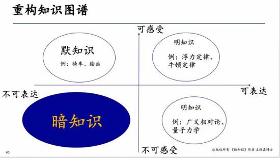 我们把知识分成两个维度:是否可表达和是否可感受。有一类知识既可感受也可表达,如阿基米德的浮力定律。我们躺在水里可以感受,也可以用很简单的公式把浮力定律写出来,同理,牛顿的三大定律也是如此,它们都是既可感受又可表达的知识;还有一类是我们可以表达但无法感受的知识。如广义相对论、量子力学、微观世界的运动规律等,我们无法感受它们,它们却能清晰地用数学方程式表达出来。