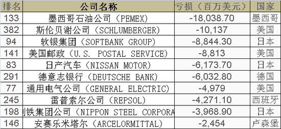 另外,今年共有45家公司未能实现盈利。在亏损公司子榜上,墨西哥石油公司亏损约180.38亿美元,成为亏损最多公司。