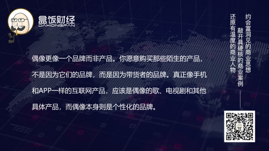 “偶像更像一个品牌而非产品。”在她看来,未来的偶像产业会进一步向品牌化的方向进化。而直播带货其实已经是一种预兆。“你愿意购买那些陌生的产品,不是因为它们的品牌,而是因为带货者的品牌。真正像手机和APP一样的互联网产品,应该是偶像的歌、电视剧和其他具体产品,而偶像本身则是个性化的品牌。”