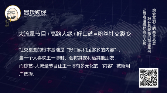“大流量节目+高路人缘+好口碑=粉丝社交裂变”,研究粉丝经济十年的某音乐类APP创始人张泉对《盒饭财经》表示,社交裂变的根本基础是“好口碑和足够多的内容”。“当一个人喜欢王一博时,会将其安利给其他朋友,而综艺+大流量节目让王一博有多元化的‘内容’被新用户选择。”