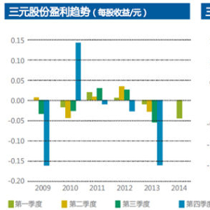 4月9日,三元股份发布的2013年年报显示,2013年三元股份营收37.9亿元,净利润亏损2.27亿元,经营活动产生的现金流量为-2720万元,基本每股收益为-0.256元。随后,三元股价持续下跌,至今已经跌破7元钱。