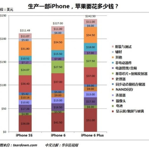 科技网站Teardown.com最近对iPhone的生产成本做了一次全面的解析,结果如下图所示,iPhone 5s、iPhone 6和iPhone 6 Plus的成本分别只有211.49美元、227美元和242.5美元。