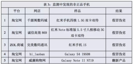 监测结果显示,购买的7部手机产品中有5部都是非正品,这5部除1部购买自中关村电子商城外均购自淘宝网。