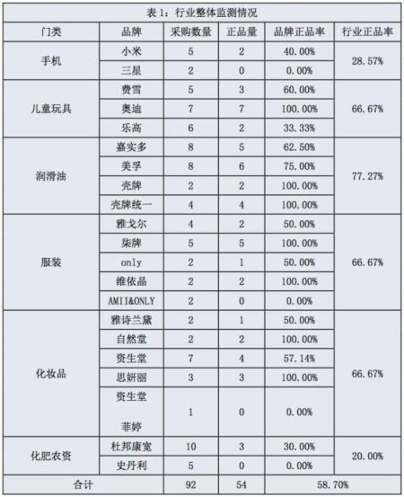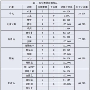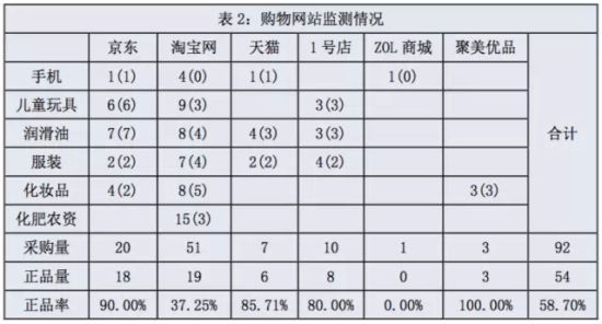 网购商品监测结果显示,所有抽取的92件样品中有38件样品是非正品,存在假冒伪劣、翻新、产品含量与宣传不符、无3C认证、非授权正规渠道销售等问题。销售非正品的网站涉及京东、淘宝、天猫、1号店、中关村电子商城。淘宝网分布样本数量最多,正品率最低,51件样品中有32件非正品,正品率仅为37.25%。目前,国家工商总局已对相关违法经营者和第三方网络交易平台经营者进行依法查处。