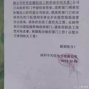 12月25日,圣诞节。深圳中天信电子有限公司(中天信)几千名工人却在这天丢掉了工作。这家老牌的手机代工厂当日起与所有在籍员工解除劳动合同,公司已经向政府部门申请结束营业。