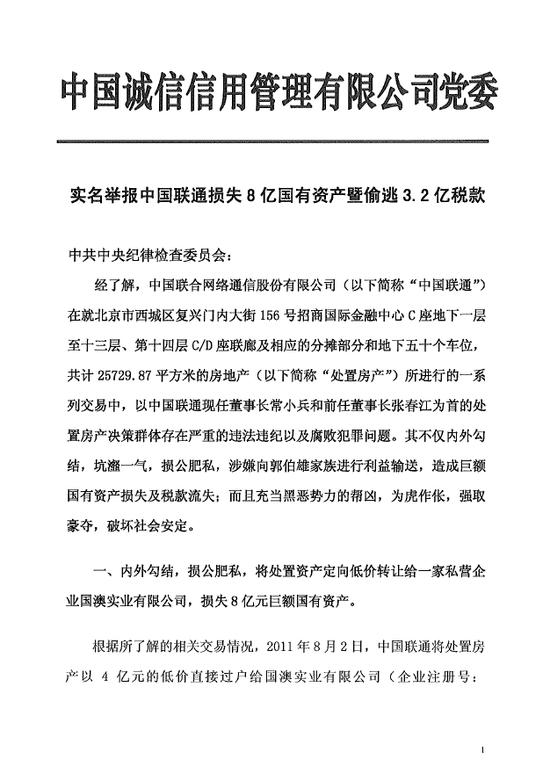 谈到可能涉及的违规问题,众说纷纭。南都记者获得的一份举报信显示,今年1月份,中国诚信信用管理有限公司(以下简称“举报方”)曾实名举报“中国联通现任董事长常小兵为首的处置房产决策群体存在违规违纪及腐败犯罪等问题”,在举报信中,举报方提及的三个举报问题包括:“1)将处置资产以低价转让给私企国澳实业,致使8亿国有资产流失;2)联合中证公司、国澳实业偷逃3 。2亿税款;3)无理处理处置资产周边物业”。南都记者联系举报信上的联系方式,举报人表示,这个举报是经过与行业业内人士深入沟通取证而来,但当时举报之后也没收到有关部门任何反馈。