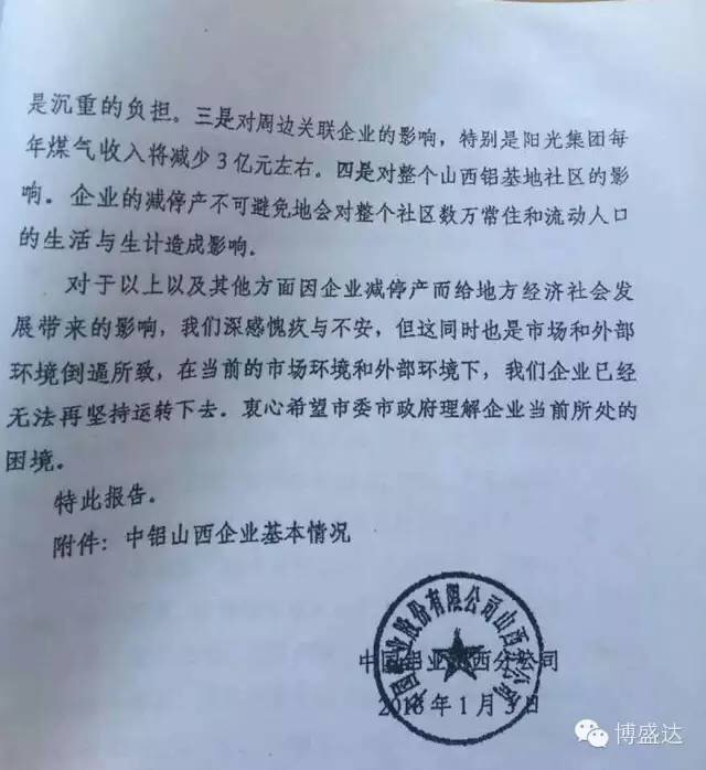 1月9日,微信公号“博盛达”发出一份盖有中铝山西分公司印章的文件。该文件称,中铝山西分公司计划在一季度内实行减产甚至全面停产,届时,将有约1.3万名员工面临下岗失业。